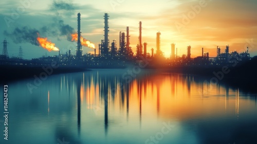 Industrial refineries emitting smoke at sunset waterfront view landscape photography urban environment environmental impact