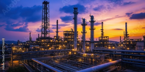 Industrial Refinery Complex at Sunset: Processing, Refining, and Production of Petroleum Products at Dusk