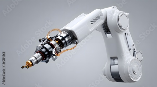 Industrial Robotic Arm for Automation and Advanced Manufacturing, 3D Rendering of Futuristic High-Tech Mechanical Equipment on Grey Background