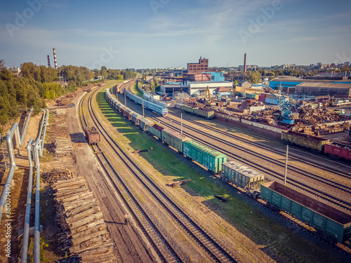 Industrial scene with trains, railway platform, Metalworking plant, top view from a drone. Freight train. The carriages of goods by rail. Heavy industry.