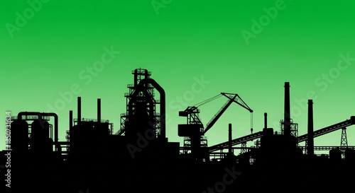 Industrial silhouette with crane and factory buildings against green background