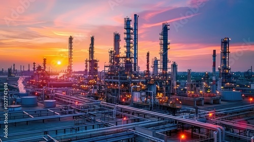 Industrial skyline at sunset showcasing refinery structures and pipelines against a vibrant sky