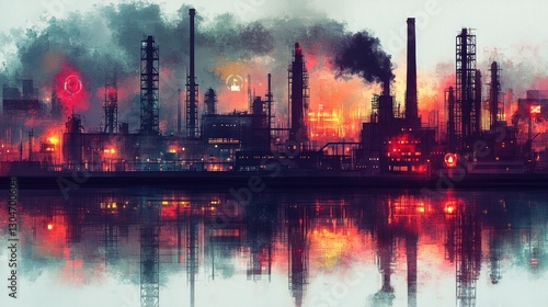Industrial skyline reflects fiery sunset water