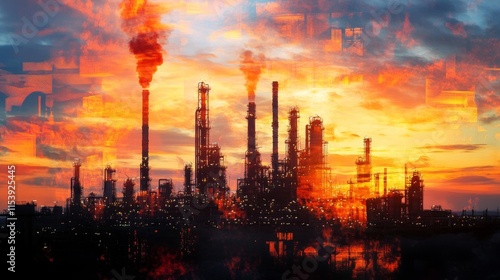 Industrial sunset over oil refinery urban landscape digital art vibrant colors wide angle environmental impact