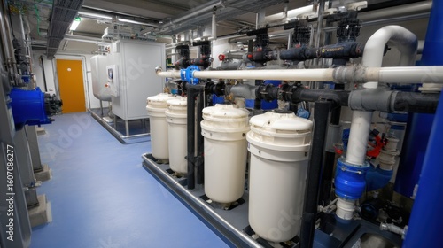 Industrial water treatment unit featuring multiple filtration tanks and piping systems. facility is designed for efficient waste management and water purification, showcasing advanced technology