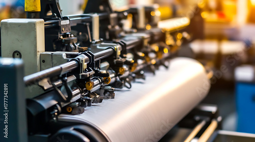 Industrial weaving: A detailed view of a complex machine used in textile manufacturing, highlighting its precision, mechanics, and the smooth, continuous process of fabric production.