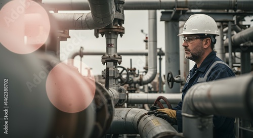Industrial Worker Inspecting Complex Pipeline System Safety, Maintenance, and Energy Production