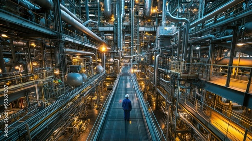 Industrial Worker Walking Through a Complex Network of Pipes and Catwalks in a Processing Plant