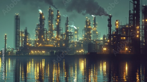 Industriegebiet mit auf dem Wasser reflektierten Nachtlichtern, das eine groÃe Ãlraffinerie und moderne Fabrikgebäude zeigt, Konzept Industrie