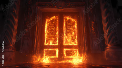 Infernal cathedral doors with an unholy glow and arcane inscriptions. Infernal - Volcano. Illustration