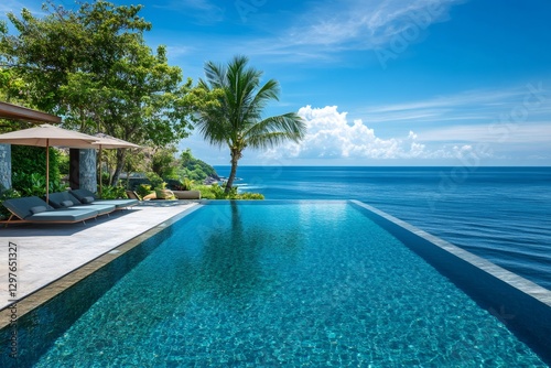 Infinity pool overlooking tropical ocean under cloudy sky