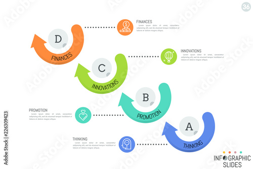 Infographic design template. Four round elements arranged in diagonal line, surrounded by arrows and connected with icons and text boxes. Implementation of innovation concept. Vector illustration.