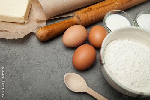 Ingredients for Easter cake, empty space for text.