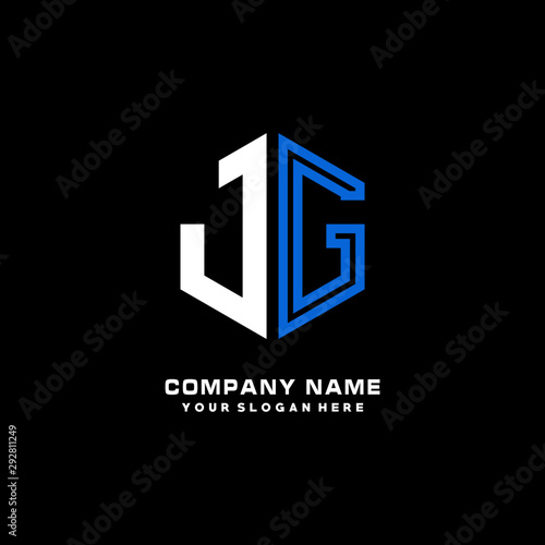 Initial letter JG minimalist line art hexagon shape logo. color blue,white,black background