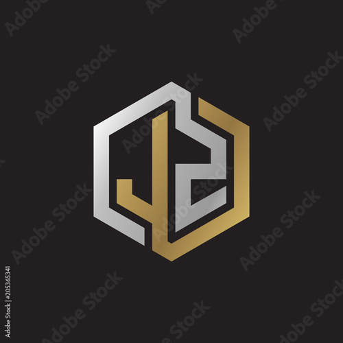 Initial letter JZ, looping line, hexagon shape logo, silver gold color on black background