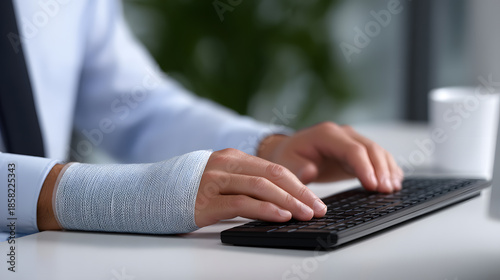Injured Hand Typing on Keyboard: Close-up of an injured person typing on a keyboard, highlighting the challenges of working with a bandaged wrist.