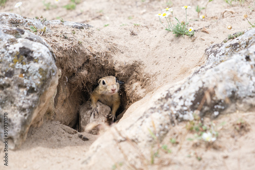 Innocent Funny and Curious Animal , European ground squirrel looking from tunnel in the land