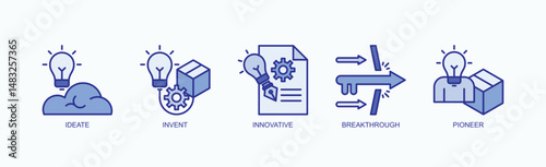 Innovation And Vision Icon Set Isolated Vector With Icon Of Ideate, Invent, Innovative, Breakthrough, Pioneer In Blue Style