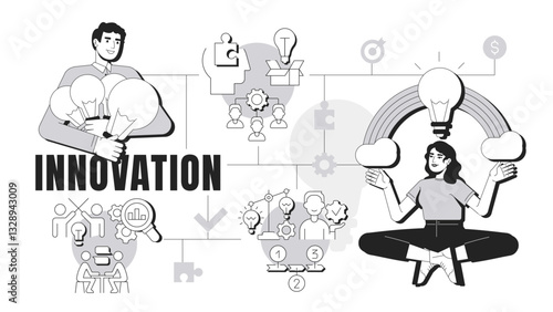 Innovation banner conceptual illustration. Brainstorm, teamwork. Communication, discussion. Ideas generation. Abstract idea with stylized characters, outline icons. Monochrome vector