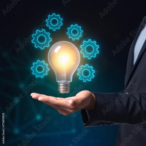 Innovative business ideas illuminated floating glowing lightbulb above businessman's hand with futuristic holographic gears in a modern office environment showcasing creativity and innovation