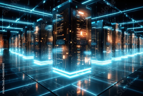 Inside datacenter in the future. Dark server room