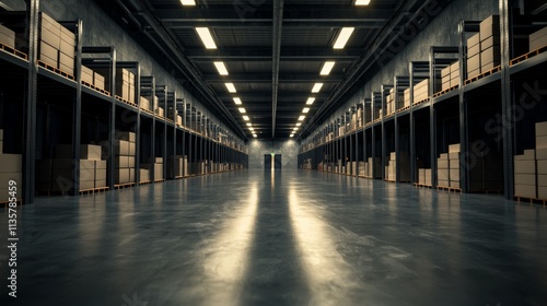 Inside the warehouse, steel shelves holding boxes create a structured environment. The smooth concrete floor glows under the neon lights, with shadows adding subtle contrast.