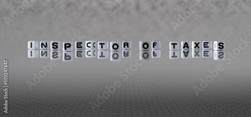 inspector of taxes word or concept represented by black and white letter cubes on a grey horizon background stretching to infinity