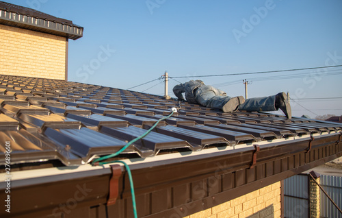 Installation of metal drain on the roof of the house