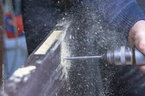 Installing a door, Install a door lock, use a milling saw, a carpenter close-up holds a green electric drill