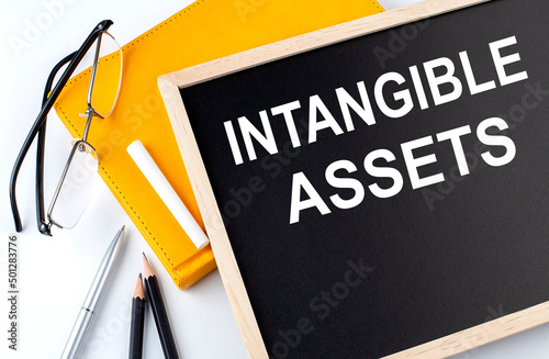 INTANGIBLE ASSETS text on the blackboard with notepad , pen, pencil