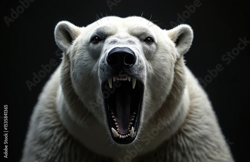 Intense close-up of roaring polar bear reveals raw power. White fur, dark eyes and open mouth with sharp teeth express wild arctic predator fierce nature. Dangerous wildlife. Dark background.