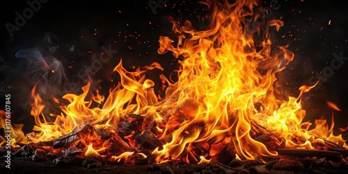 Intense Flame with Glowing Embers on Dark Background , intense flame, dark background