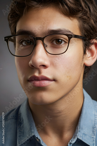Intense Gaze: A youthful individual with glasses. Expressing a thoughtful and observant, is captured in a close-up portrait, conveying a sense of intelligence.