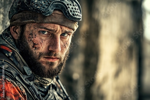 Intense gaze of dirty, battle-worn soldier with piercing eyes