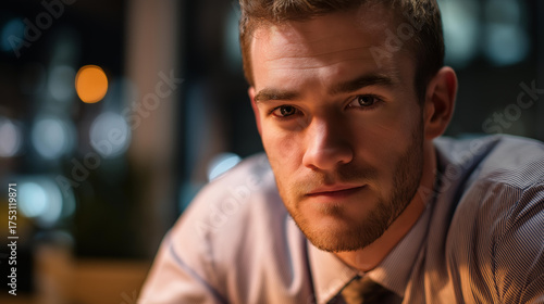Intense portrait of focused professional in dramatic lighting crop below eyes background softly defocused determined expression dramatic portrait serious mood concentrated