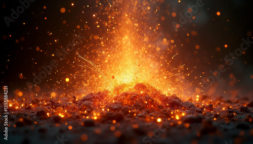 Intense Volcanic Eruption with Fiery Sparks and Lava, Powerful Explosion in Dark Background.