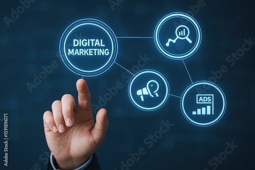 Interactive digital marketing network concept with hand pointing at virtual icons and data analytics visualization.