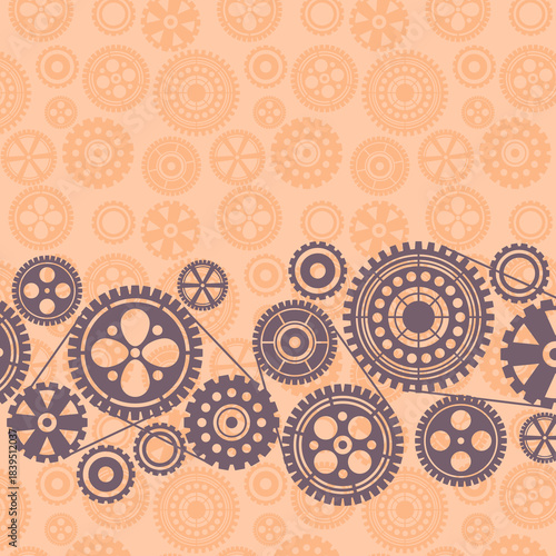 Interconnected Gear Icon Illustration – Dark Purple Mechanical Cogs on Peach Background