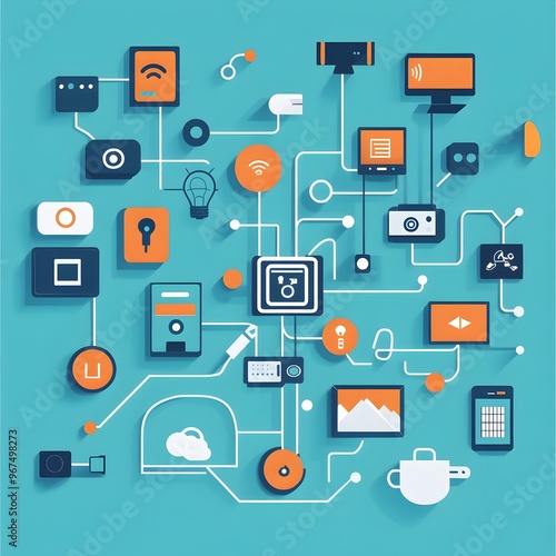 Interconnected Smart Devices and Data Sharing in a Digital Network of the Internet of Things IoT Concept with Flat Design Icons and Symbols
