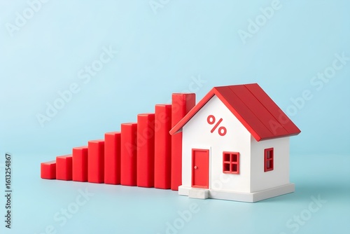 Interest Rate Surge – Rising Bar Graph and Percentage Symbol Next to House Model, Real Estate Market Shift, Mortgage Cost Increase Concept, Blue Background