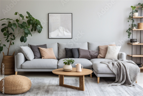 Interior design of cozy living room with stylish sofa, coffee table, green plants, rug, decoration in modern home decor