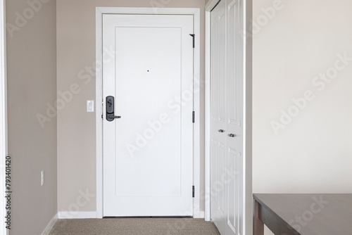 Interior door with door lever. Apartment door with deadbolt lock.