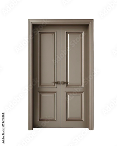 Interior, gray double door with raised panels against a black backdrop