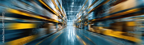 Interior of a high-speed warehouse. Motion blur of shelves filled with goods. Perspective down a long aisle of a modern distribution center. Fast-paced, dynamic, and efficient