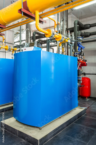 interior of an industrial gas boiler room with boilers and pipelines