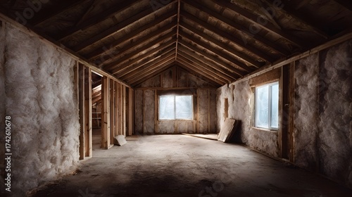 Interior of an unfinished house under construction showcasing insulated walls and exposed wooden roof structure