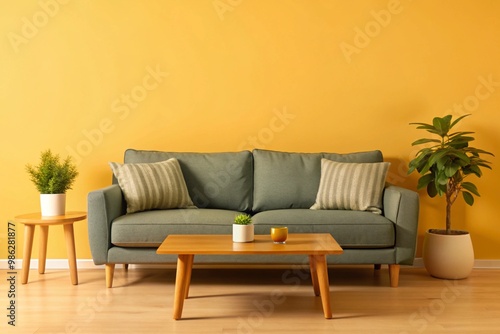 Interior of light living room with cozy grey sofa and wooden coffee table