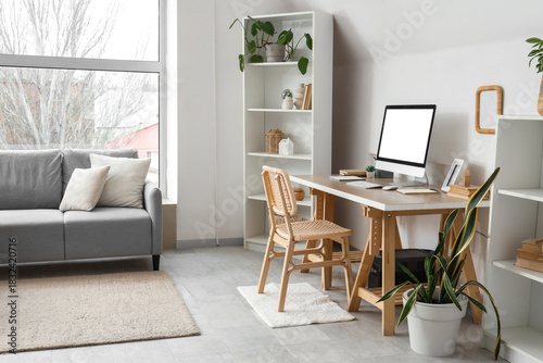 Interior of light office with workplace, shelf units and sofa