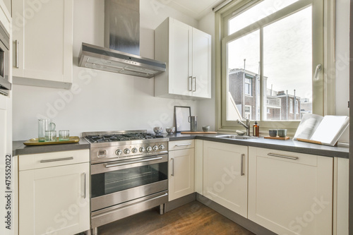 Interior of spacious kitchen placed near window