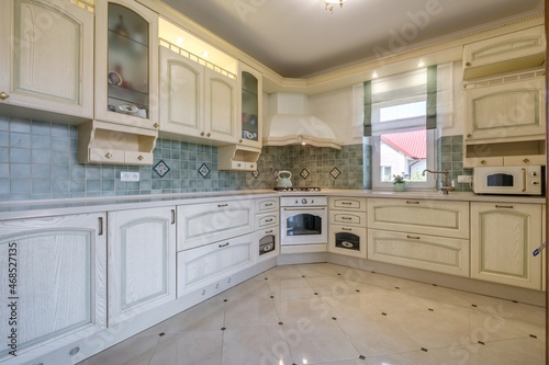 Interior of the modern luxure kitchen in studio apartments with light color